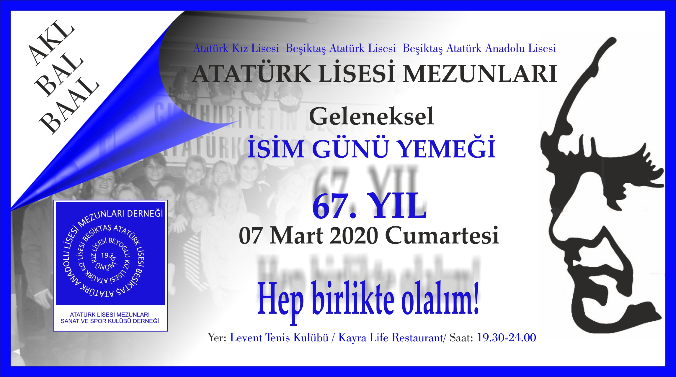 Okulumuzun “Atatürk” ismini alışının 67. yıl dönümü şerefine GELENEKSEL İSİM GÜNÜ YEMEĞİMİZ 7 Mart 2020 Cumartesi günü Levent Tenis Kulübü / Kayra Life Restaurant‘ta gerçekleştirilecektir. İsim Günü yemeğimizde zengin menü ve sınırsız yerli içki sizlere canlı müzik eşliğinde sunulacaktır. Tüm mezunlar olarak hep beraber olacağımız, okul anılarımızı tazeleyip arkadaşlarımız ve öğretmenlerimiz ile hasret gidereceğimiz yemeğimizde geceye katılım ücreti olarak kişi başı 160 TL ödenecektir. Katılmak isteyen mezunlarımız bu bedeli açıklama kısmına İsim Günü Yemeği/Ad- Soyad yazarak;